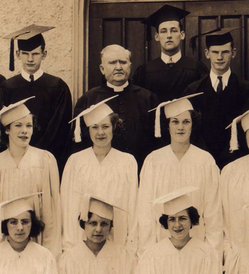 Here is a closer look. That is Father Pindar top center. My Uncle Jim is on the left and my dad is on the right. Yes, they were identical twins. My mom is in the bottom row center beneath Father Pindar. She was valedictorian despite having blown up the chemistry lab. That is why I was never allowed to have a chemistry set – the real reason (i.e. not because “girls don’t have chemistry sets”).