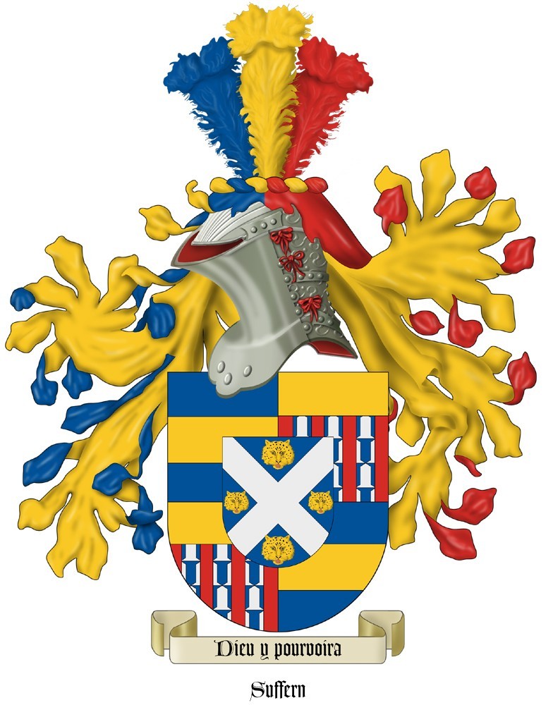 And here is the information I received with it: Name: Suffern; Record: 35609; Provence, France, first ennobled in 1537, created Marquis de St. Tropez in November 1725. Arms: Quarterly, 1st and 4th, azure, a fesse or; 2nd and 3rd, gules, three palets vair, a chief or. Over all an inescutcheon azure, a saltire argent between four leopards; faces or. (Once again we see heraldic tradition using French – “argent” for “silver”, and “or” for “gold”). Motto: Dieu y pourvoira (God will provide for it).